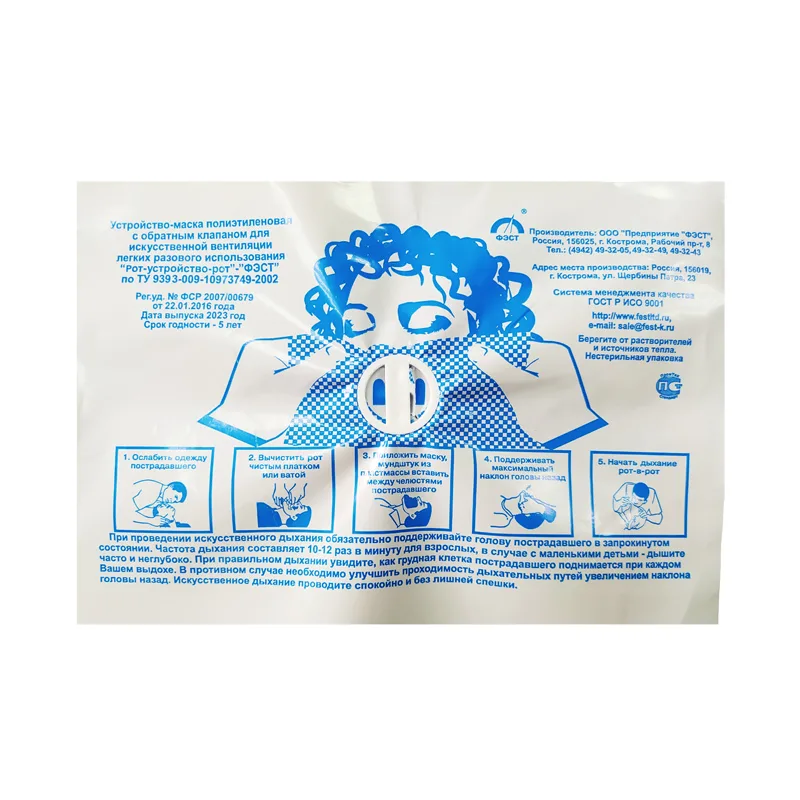 Устройство-маска полиэтиленовая с обратным клапаном для искусственной вентиляции легких разового использования «Рот-устройство-рот» - «ФЭСТ» предназначена для проведения искусственного дыхания методом «рот-в-рот» у взрослых и детей вне медицинских учреждений.