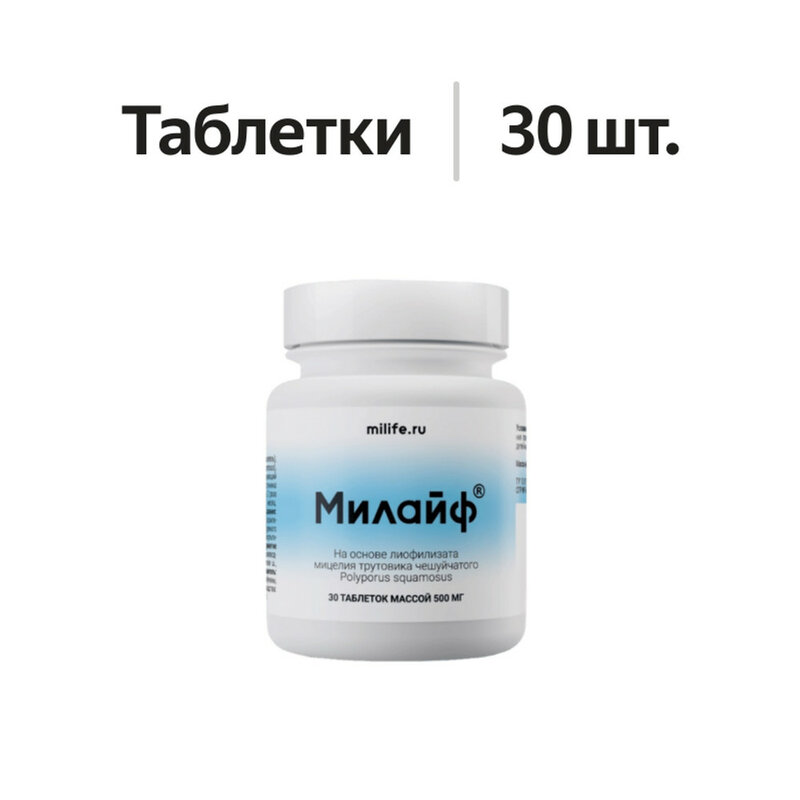 Милайф® - парафармацевтик растительного происхождения, представляет собой биомассу лиофилизата монокультуры гриба трутовика чешуйчатого (Polyporus squamosus PS-64) с оптимально измененной молекулярной массой, с целью максимально увеличить усвояемость, содержит уникальный природный комплекс биологически активных веществ.