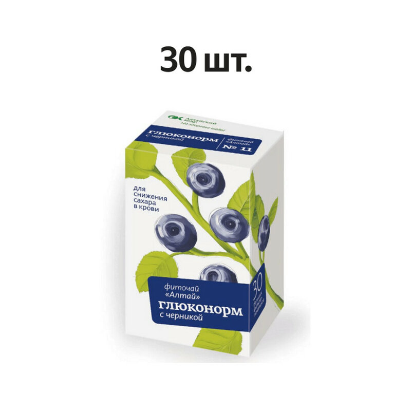 Фиточай «Алтай» №11 «Глюконорм. С черникой». Черника обладает натуральным инсулиноподобным действием при сахарном диабете, способствует снижению содержания сахара в крови и моче, восстановлению обмена веществ в организме. Также она используется при аллергии и хроническом панкреатите. Листья Черники - способствуют снижению содержания сахара в крови и моче при диабете, стимулируют обмен веществ. Корень Лопуха - нормализует состав крови. Лучшее средство, восстанавливающее обменные процессы в организме, используют при аллергии и сахарном диабете. Створки Фасоли - снижают количество сахара в крови, имеют инсулиноподобное действие при сахарном диабете. Эффективны при хроническом панкреатите. Трава Хвоща - как средство для очищения организма, улучшает обмен веществ. Трава Горца Птичьего обладает общеукрепляющим действием, снижает уровень сахара в крови и моче, мочегонное.