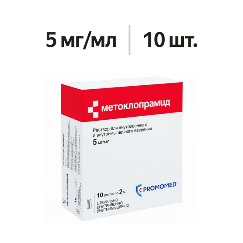 Действующее вещество: метоклопрамида гидрохлорид (в форме гидрата) 5 мг. Вспомогательные вещества: натрия метабисульфит (натрия дисульфит) - 0.075 мг, натрия хлорид - 8 мг, динатриевая соль этилендиаминтетрауксусной кислоты (трилон Б) - 0.25 мг, вода для инъекций - до 1 мл.