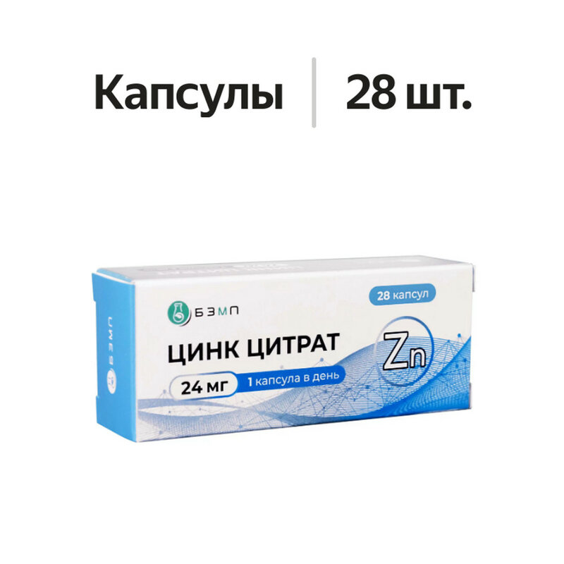 Содержание активных веществ в 1 капсуле: Цинка цитрат 76 мг, в т.ч цинк 24 мг.