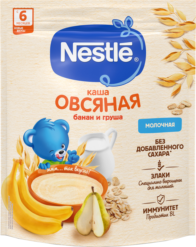 мука овсяная (содержит глютен), молоко сухое обезжиренное, низкоэруковое рапсовое масло, хлопья банана, хлопья груши, подсолнечное высокоолеиновое масло, подсолнечное масло, кальция карбонат, соль, витаминно-минеральный премикс (С (L-аскорбиновая кислота), РР (никотинамид), цинка сульфат, E (DL-альфа-токоферола ацетат), B5 (D-пантотенат кальция), A (ретинола ацетат), В1 (тиамина мононитрат), В6 (пиридоксин гидрохлорид), В2 (рибофлавин), йодид калия, B9 (фолиевая кислота), D (D3 холекальциферол)), железа (II) фумарат, бифидобактерии не менее 1х106 КОЕ/г, антиокислители (альфа-токоферол (содержит сою), L-аскорбилпальмитат)