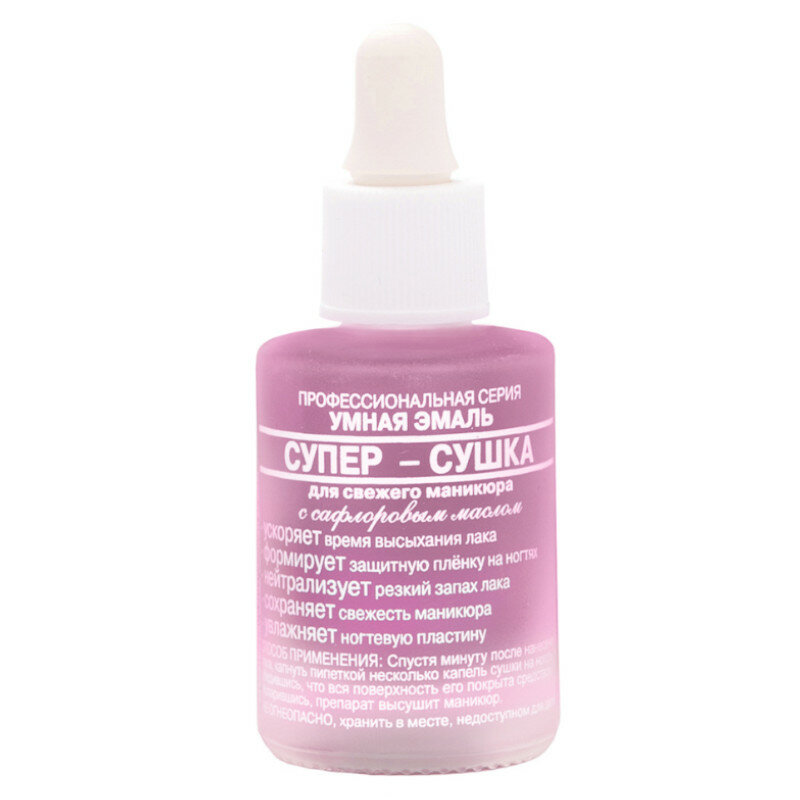 Известно, что лак сохнет слоями. Чтобы многократно сократить время высыхания, нужно использовать препарат "Суперсушка" Умная Эмаль. Тонкая пленка на поверхности лака образуется уже от одной капли суперсушки, защищая его от повреждений. При этом высыхание идет равномерно, без сдвига слоев лака. Вы не только не будете страдать от сильного запаха свежего лака, но и приобретете крепкие, здоровые ногти, благодаря идеальной формуле и сочетанию ингредиентов.