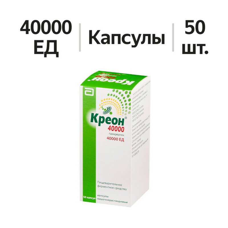 Ферментный препарат, улучшающий процессы пищеварения у взрослых и детей и, тем самым, значительно уменьшающий симптомы ферментной недостаточности поджелудочной железы, включая боль в области живота, метеоризм, изменение частоты и консистенции стула. Панкреатические ферменты, входящие в состав препарата, облегчают расщепление белков, жиров, углеводов, что приводит к их полному всасыванию в тонкой кишке. Капсулы желатиновые Креон® 40000, содержащие свиной панкреатин в форме минимикросфер, покрытых кишечнорастворимой (кислотоустойчивой) оболочкой, быстро растворяются в желудке, высвобождая сотни минимикросфер. Целью данного принципа является одновременный пассаж (поступление) минимикросфер с пищей из желудка в кишечник и тщательное перемешивание минимикросфер с кишечным содержимым и, в конечном счете, лучшее распределение ферментов после их высвобождения внутри кишечного содержимого. Когда гранулы достигают тонкой кишки, кишечнорастворимая оболочка разрушается (при pH >5.5), происходит высвобождение панкреатических ферментов с липолитической, амилолитической и протеолитической активностью, что приводит к расщеплению жиров, углеводов и белков. Полученные в результате расщепления вещества затем либо всасываются напрямую, либо подвергаются дальнейшему расщеплению кишечными ферментами.