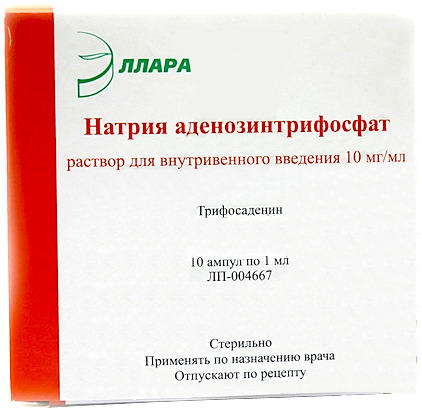 1 ампула содержит: трифосаденин (натрия аденозинтрифосфат) 10 мг. Вспомогательные вещества: Натрия карбонат безводный - 4,4 мг, Натрия гидрокарбонат - 8,0 мг, Динатрия эдетата дигидрат - 0,2 мг, Пропиленгликоль - 0,1 мл, Вода для инъекций - до 1,0 мл.