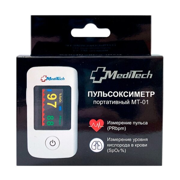 Пульсоксиметр MediTech МТ-01 предназначен для быстрого измерения пульса и уровня насыщения кислородом гемоглобина артериальной крови человека у взрослых и детей в медицинских учреждениях и в домашних условиях. Прибор обеспечивает автоматическое измерение и индикацию степени насыщения кислородом гемоглобина артериальной крови человека неинвазивным методом в диапазоне от 70 до 99 % и частоты пульса в диапазоне от 30 до 240 ударов/мин; уровня пульсовой волны, отображение фотоплетизмограммы на дисплее OLED. Функции прибора: быстрое измерение частоты пульса в диапазоне от 30 до 240 ударов/мин; быстрое измерение уровня насыщения кислородом крови в диапазоне от 70 до 99%; отображение уровня пульсовой волны и плетизмограммы для оценки состояния тонуса сосудов; функция «Тревожной сигнализации». В случае если уровень сатурации ниже установленного предельно низкого уровня и частота пульса выше или ниже предельных уровней, то результат измерения отображается красным цветом в мигающем режиме.