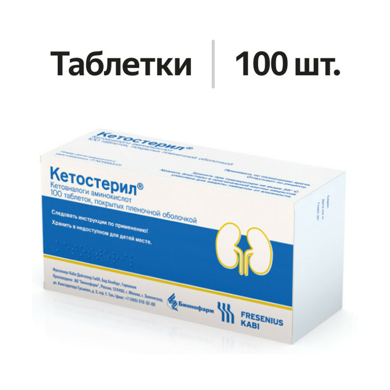 Активные вещества: изолейцина альфа-кетоаналог (DL-метил-оксо-2-кальций валеринат) - 67 мг, лейцина альфа-кетоаналог (метил-4-оксо-2-кальций валеринат) - 101 мг, фенилаланина альфа-кетоаналог (оксо-2-фенил-3-кальций пропионат) - 68 мг, валина альфа-кетоаналог (метил-оксо-2-кальций бутират) - 86 мг, метионина альфа-гидроксианалог (DL-гидрокси-2-кальций метилбутират) - 59 мг, L-лизина моноацетат - 105 мг, L-треонин - 53 мг, L-триптофан - 23 мг, L-гистидин - 38 мг, L-тирозин - 30 мг. Вспомогательные вещества: крахмал кукурузный - 44 мг, поливинилпирролидон - 6 мг, тальк - 19,57 мг, кремния диоксид коллоидный - 4,4 мг, магния стеарат - 15 мг, полиэтиленгликоль 6000 - 12,8 мг, поливинилпирролидон растворимый - 43,2 мг; оболочка пленочная: тальк - 9,1 мг, полиэтиленгликоль 6000 - 1,48 мг, хинолиновый желтый (E104) - 0,72 мг, метилметакрилата, диметиламиноэтилметакрилата и бутилметакрилата сополимер (эудрагит Е12,5) - 5,9 мг, триацетин - 0,43 мг, титана диоксид - 7,4 мг. Показатели: общее содержание азота - 36 мг, содержание кальция - 50 мг (1,25 ммоль).