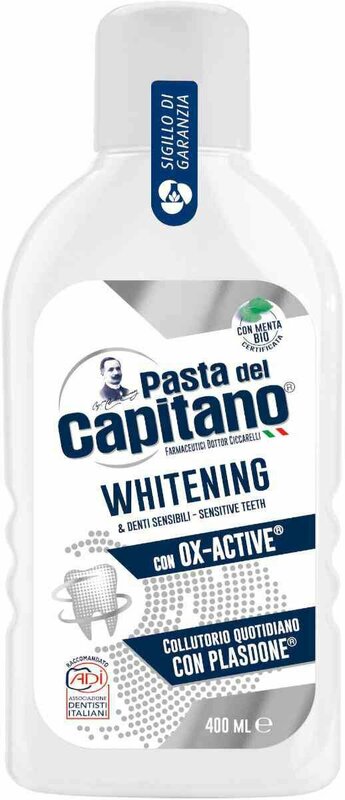 Итальянский бренд Pasta Del Capitano — полная линейка продуктов для защиты полости рта для всей семьи. Pasta del Capitano Ополаскиватель для полости рта Whitening with OX-Active / Отбеливающий с активным кислородом. Ополаскиватель создан специально для удаления пятен на зубах. Его инновационная формула, содержащая молекулу Plasdone, позволяет восстановить естественную белизну зубов, не повреждая эмаль. Ополаскиватель оставляет приятное ощущение свежести благодаря входящему в состав экстракту сертифицированной органической мяты. Идеально подходит даже для чувствительных зубов, ведь цитрат калия снижает чувствительность зубов, а бетаин снимает и предотвращает раздражение дёсен.