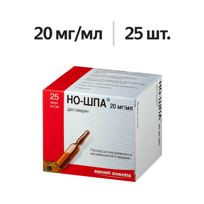Дротаверина гидрохлорид 20 мг. Вспомогательные вещества: натрия дисульфит (натрия метабисульфит) - 2 мг, этанол 96% - 132 мг, вода д/и - до 2 мл.