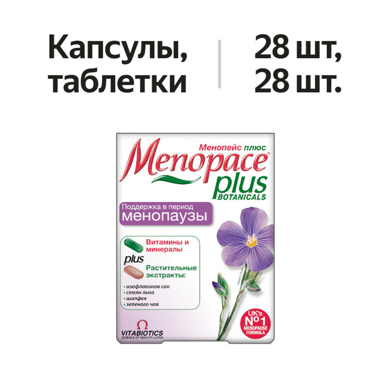 Менопейс плюс - это двойная упаковка, которая содержит таблетки Ботаник Актив с натуральным растительным комплексом фитоэстрогенов и мультивитаминные таблетки Менопейс