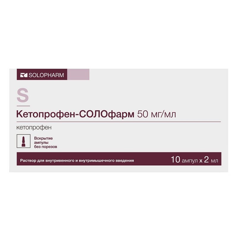 В 1 мл: действующего вещества - кетопрофен 50 мг; Вспомогательные вещества: пропиленгликоль - 400 мг, этанол 95% (в пересчете на безводное вещество) - 100 мг, бензиловый спирт - 20 мг, 10М раствор натрия гидроксида - до pH 6.0-7.5, вода д/и - до 1 мл.