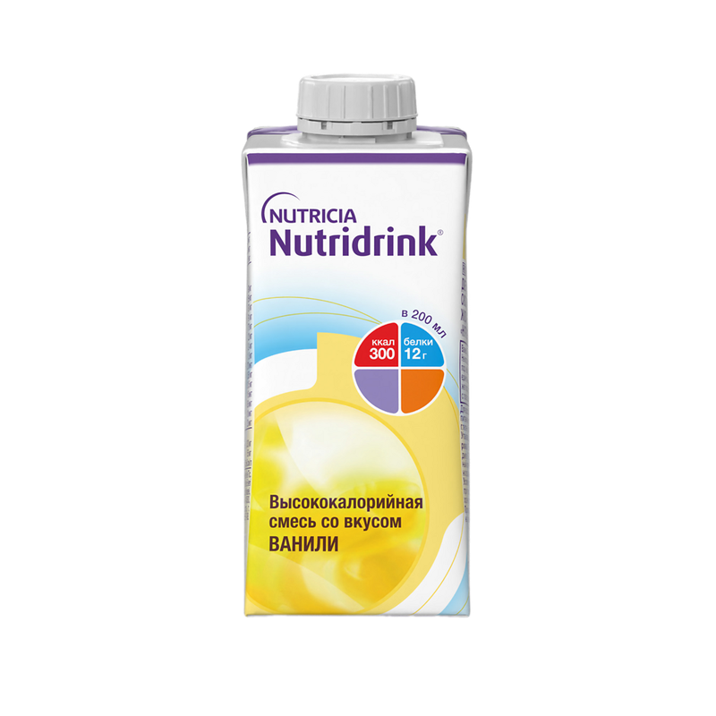 Специализированный продукт диетического лечебного и диетического профилактического питания жидкая высококалорийная смесь для энтерального питания «Нутридринк» со вкусом ванили для ускорения восстановления в период лечения и реабилитации. Nutridrink - cбалансированный источник белка, энергии и необходимых нутриентов, помогает восстановить силы после болезни. Продукт предназначен для взрослых пациентов с недостаточностью питания или риском ее развития, возникающими при инсульте, травмах, инфекциях, хронической обструктивной болезни легких, хронических заболеваниях системы пищеварения, в пред- и послеоперационный период Высококалорийный продукт содержит натуральные каротиноиды, витамины группы B, С, Е , D3 , К, фолиевую и пантотеновую кислоты, микроэлементы (хром, селен, медь) и минеральные вещества (натрий, калий, кальций, фосфор, магний, железо, цинк, марганец). В линейке представлено 3 вкуса для разнообразия рациона: ваниль, клубника, банан. Может употребляться в качестве дополнительного или единственного источника питания. Клинически значимый эффект наступает при приеме не менее чем в течение 14 дней. Длительность приема не ограничена (1–3 бутылочки в день как дополнение к диете, 5–7 бутылочек в день как единственный источник питания, если иное не назначено врачом). Только для энтерального питания. Не использовать парентерально. Ключевые особенности: Полноценное, сбалансированное по составу, легкоусвояемое питание. Оптимальное содержание белка (~ 12 г в одной бутылочке). Оптимальное соотношение жирных кислот Омега-6 : Омега-3 как 5:1 обеспечивает противовоспалительную и иммуномодулирующую защиту. Содержит 13 витаминов и 15 минералов. Возможно применение у пациентов с диабетом (содержит 1,8 хлебные единицы в 100 мл).