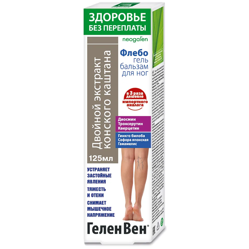 Вода, глицерин, карбомер, коко-каприлат/капрат, дикаприлиловый эфир, водный экстракт каштана конского концентрат двойной, водные экстракты гамамелиса, софоры японской, гинкго билобы, ментол, троксерутин, диосмин, дигидрокверцетин, феноксиэтанол, этилгексилглицерин, парфюмерная композиция, гидроксид натрия, динатриевая соль ЭДТА, бензилсалицилат, бутилфенил метилпропионал.