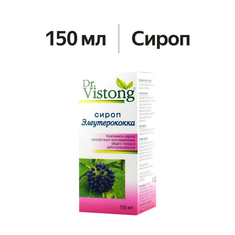 Элеутерококк колючий (Eleutherococcus senticosus Maxim) - растение с многолетней историей применения (более 2000 лет). Элеутерококк был признан адаптогеном, подобно женьшеню, лимоннику и арали. Элеутерозиды элеутерококка способствуют повышению синтеза эндорфинов и активации быстрого сгорания углеводов, предотвращая превращение последних в жиры. Биологически активные вещества элеутерококка способствуют повышению умственной работоспособности, остроты зрения, адаптационных способностей организма в экстремальных ситуациях, ослаблению стрессовых реакций и повышению иммунитета.Фенольные соединения элеутерококка обладают антиоксидантными свойствами. Экстракт элутерококка в сиропе «Dr. Vistong» стандартизирован по элеутерозидам. Шиповник относится к поливитаминному растению, действие обусловлено наличием аскорбиновой кислоты и других веществ (каратиноидов, флавоноидов, органических кислот и др.), входящих в его состав. Биологически активные вещества шиповника способствуют повышению неспецифической резистентности организма. Витамин С (аскорбиновая кислота) - антиоксидант, который способствует защите организма от свободных радикалов и поддержке защитных сил организма. Аскорбиновая кислота играет важную роль в ряде метаболических функций, включая активацию витаминов группы В, усвоение железа, превращение холестерина в желчные кислоты, превращение аминокислоты триптофана в серотонин, биосинтез коллагена и карнитина.