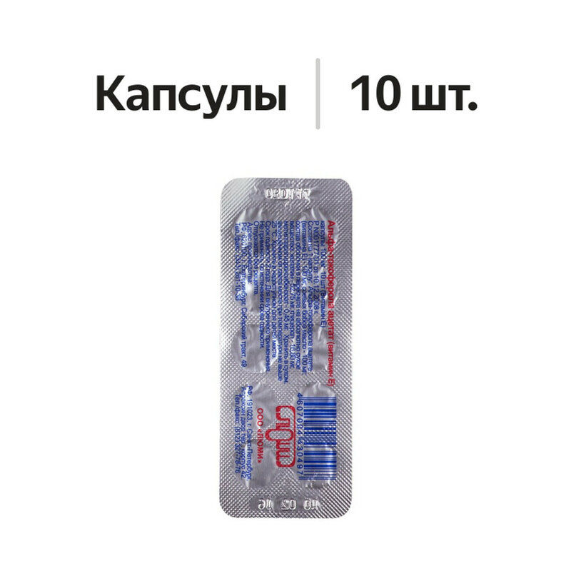 Действующее вещество: Альфа-токоферола ацетата (витамина Е) -100 мг. Вспомогательное вещество: Соевых бобов масло -100 мг. Состав оболочки в пересчете на абсолютно сухое вещество: желатин - 52,75 мг; глицерол - 16,80 мг; метилпарагидроксибензоат - 0,45 мг.