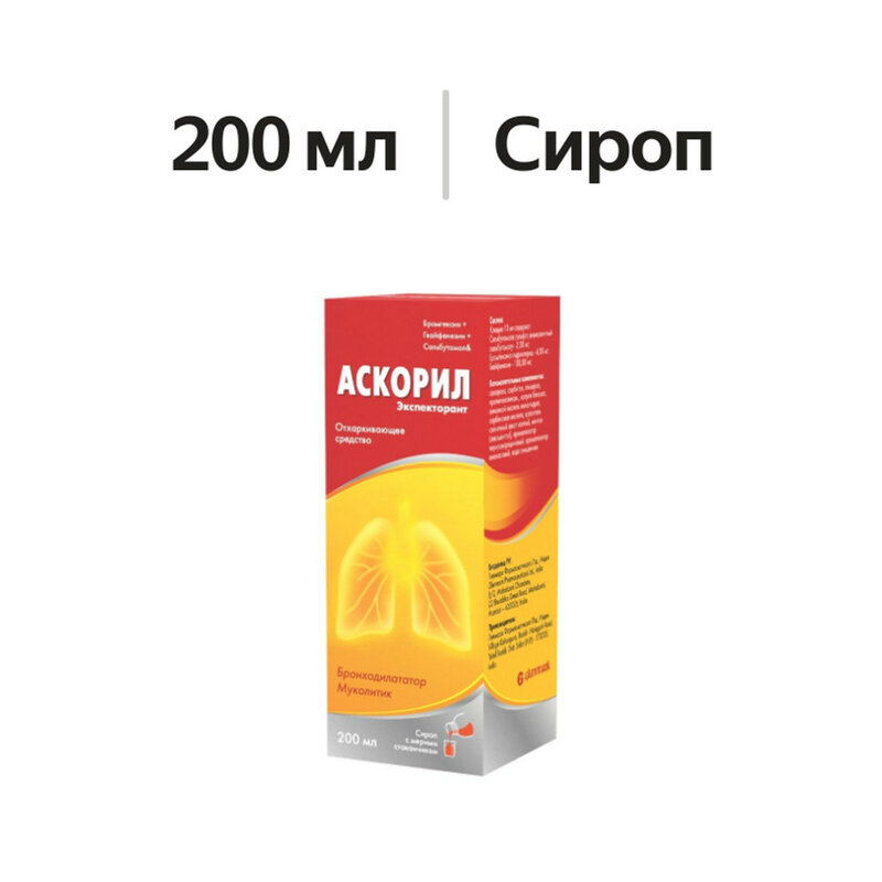 10 мл содержит: бромгексина гидрохлорид 4 мг, гвайфенезин 100 мг, сальбутамола сульфат, эквивалентный сальбутамолу 2 мг. Вспомогательные вещества: сахароза (сахар) - 5000 мг, сорбитол (70% раствор) - 2630 мг, глицерол (глицерин) - 1250 мг, пропиленгликоль - 620 мг, натрия бензоат - 20 мг, лимонной кислоты моногидрат - 24 мг, сорбиновая кислота - 10 мг, краситель солнечный закат желтый (FCF) - 0.28 мг, ментол (левоментол) - 1 мг, ароматизатор черносмородиновый (отдушка черная смородина ID20 158) - 30 мг, ароматизатор ананасовый (отдушка ананасовая супер "PH") - 10 мг, вода очищенная - до 10 мл.