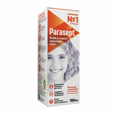 Действующее вещество не токсично и разрешено для детей с 1 года. • Комплекс натуральных антисептиков - успокаивает, заживляет и обеззараживает кожу. • Аэрозоль - самая удобная форма для нанесения средства. • Комфортное использование - комплект включает всё, что нужно для эффективного использования. • Достаточный объем средства для использования даже на длинных волосах и повторной обработки.