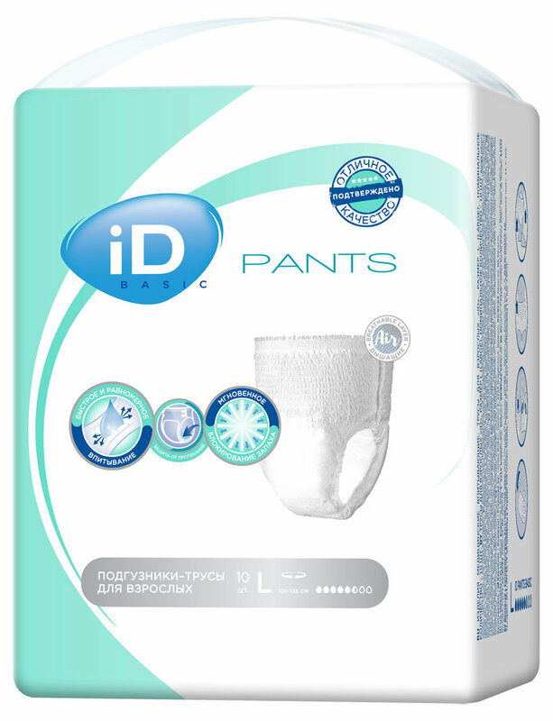 Подгузники-трусы iD Pants — это оптимальное решение при средней и тяжёлой степени недержания для людей, ведущих активный образ жизни. Внешне изделие напоминает обычное бельё, идеально прилегает к телу, незаметно под одеждой и совершенно не стесняет движений. Данные приспособления моментально впитывают и удерживают влагу, благодаря чему кожа надолго остаётся сухой. Подгузники не допускают протеканий и блокируют неприятные запахи. Использование мягких материалов при производстве дарит ощущение максимального комфорта.