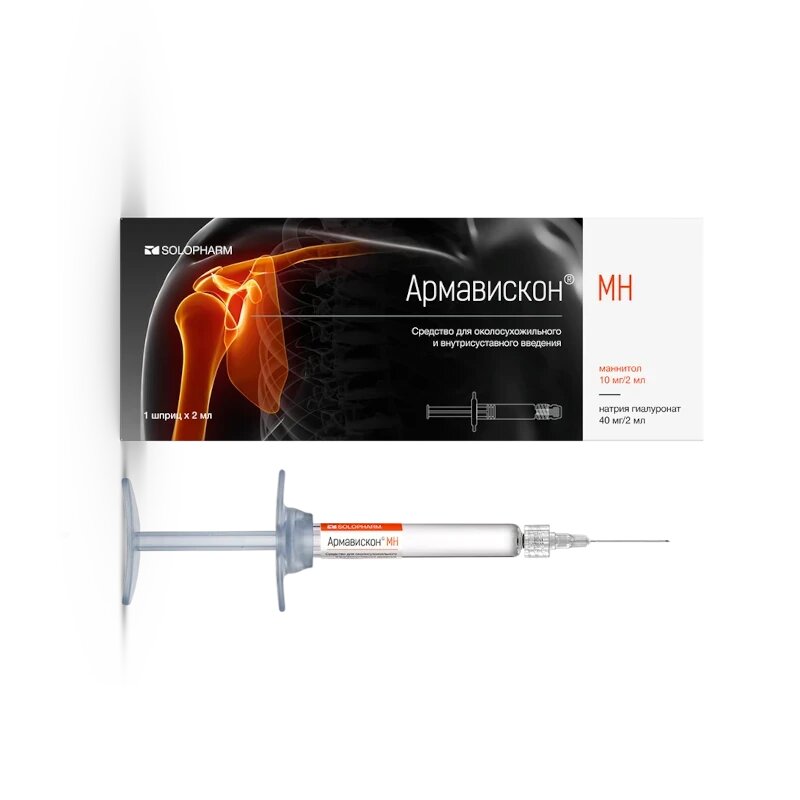Средство Армавискон МН является протезом синовиальной жидкости сухожилия и суставов. Оказывает анальгезирующее и корректирующее действие на метаболизм костной и хрящевой ткани. Применяется при дегенеративных изменениях сухожилий, поверхности синовиального хряща для улучшения подвижности суставов, уменьшения болевого синдрома, снижения воспалительных реакций и восстановления гомеостаза в сухожилии и хрящевой ткани. Основные области применения средства - ортопедия, ревматология, травматология, хирургия, спортивная медицина. Армавискон МН представляет собой стерильный вязкий раствор натриевой соли гиалуроновой кислоты (натрия гиалуроната) высокой степени очистки, высокомолекулярный (молекулярная масса составляет не менее 2.7 МДа). Гиалуроновая кислота - необходимый компонент экстрацеллюлярного матрикса, присутствует в высоких концентрациях в составе хряща и синовиальной жидкости. Гиалуроновая кислота обеспечивает вязкость и эластичность синовиальной жидкости, а также она необходима для формирования хряща. Внутрисуставное введение гиалуроновой кислоты приводит к улучшению функционального состояния сустава. Гиалуроновая кислота обладает комбинированным действием, восстанавливая и увлажняя суставы, сухожилия, связки и кожу. Раствор натрия гиалуроната распределяется местно в полости сустава или околосухожильном пространстве, где он подвергается локальным преобразованиям, оказывая смазывающее действие. Обзор исследований изделий аналогичного состава показал, что наивысшие концентрации гиалуроновой кислоты обнаружены в синовиальной жидкости, меньшие концентрации - в связках и прилегающих мышцах. Экскреция в основном осуществляется почками. В состав средства Армавискон МН входит моносахарид маннитол, который, соединяясь с натрия гиалуронатом, образует более стабильную молекулу с повышенной устойчивостью к деградации. Маннитол обладает выраженной антиоксидантной активностью, что позволяет предотвратить окислительную деструкцию гиалуроновой кислоты свободными радикалами, а также ее ферментативную деградацию гиалуронидазами (за счет предупреждения развития ацидоза при посттравматическом воспалении). Кроме того, маннитол стабилизирует клеточные мембраны, уменьшает проницаемость сосудов, оказывает противовоспалительное действие, предотвращает появление отеков после инъекций и значительно сокращает восстановительный процесс. Исходя из обзора исследования изделий с аналогичным составом, продолжительность терапевтического эффекта - до 6 месяцев и более, в зависимости от места введения и степени заболевания. Извлечение или замена средства неприменима, так как оно неотделимо смешивается с синовиальной жидкостью сустава.