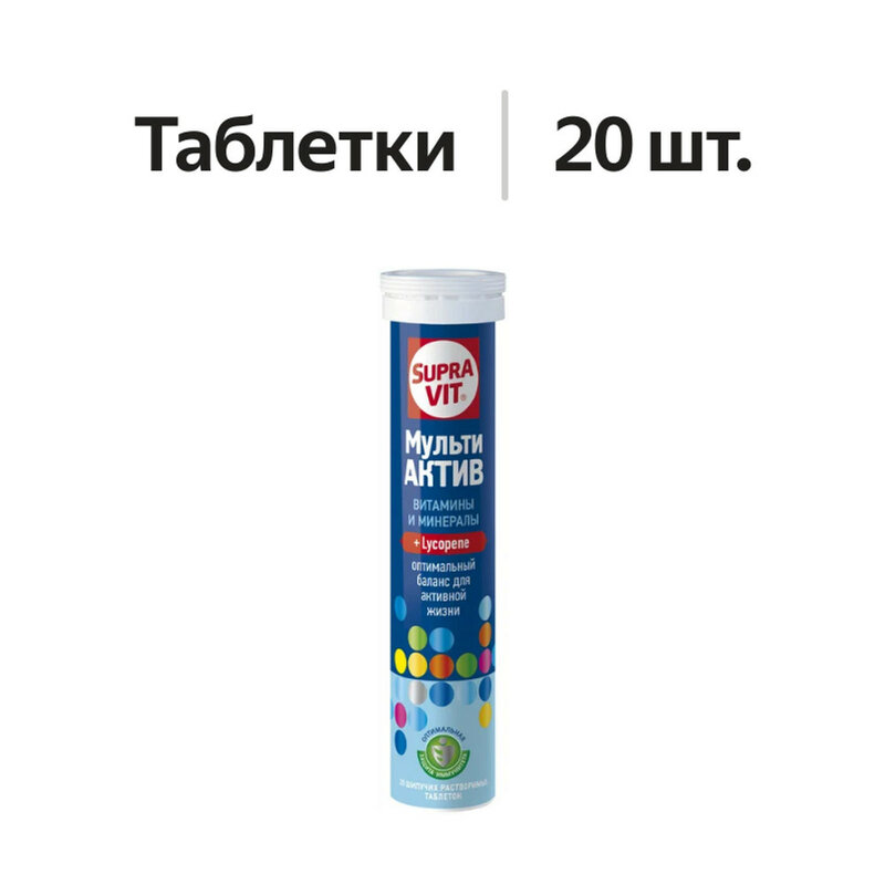 Биологически активная добавка Суправит Мульти Актив в форме шипучих таблеток содержит комплекс витаминов и минералов, дополненный ликопином.