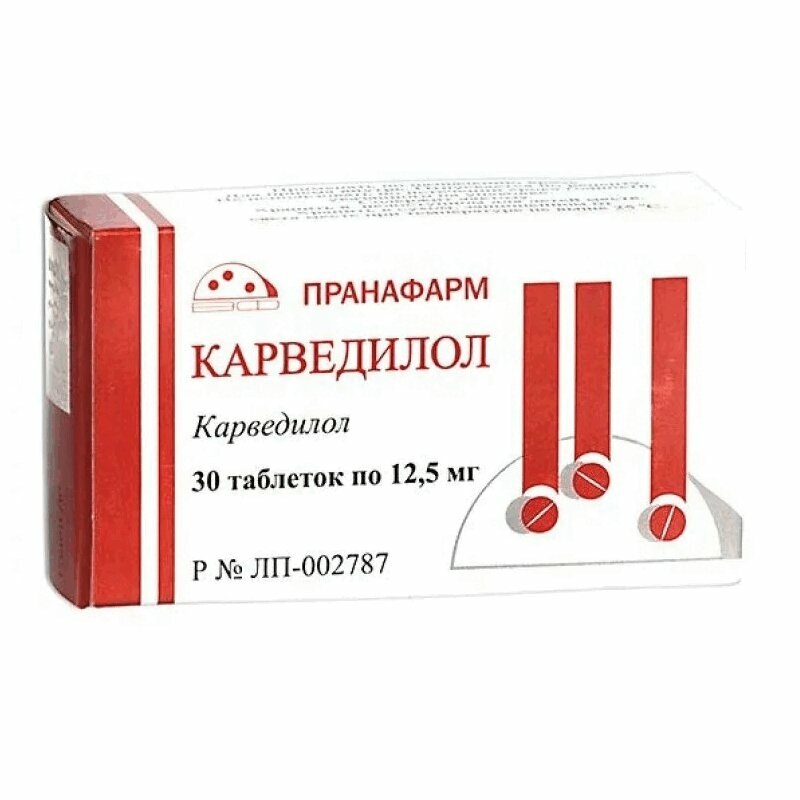 В 1 таблетке: карведилол 12.5 мг; вспомогательные вещества: лактозы моногидрат, крахмал кукурузный, целлюлоза микрокристаллическая, магния стеарат, тальк, кремния диоксид коллоидный.