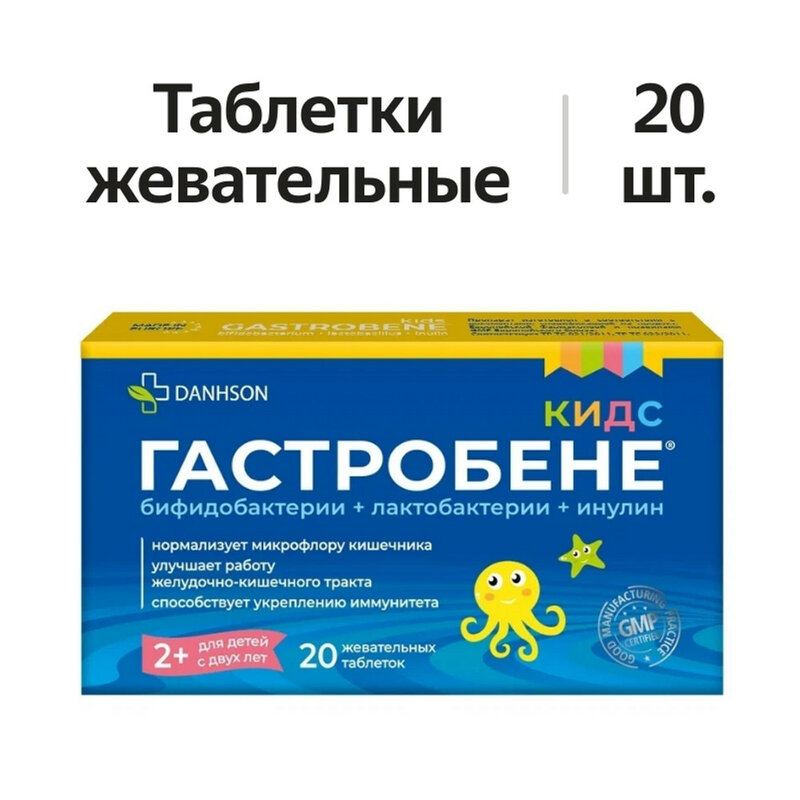 Биологически активная добавка к пище ГАСТРОБЕНЕ КИДС является синбиотиком. Синбиотики - это комбинация, состоящая из пробиотиков (лактобактерии и бифидобактерии) и пребиотика (инулин). Пробиотики являются живыми микроорганизмами, которые обеспечивают благотворное влияние на организм человека. Пробиотики нормализуют состав и функции микрофлоры желудочно-кишечного тракта, способствуют укреплению иммунной системы и пищеварению. Восстановление баланса кишечной микрофлоры позволяет нормализовать такие неприятные проявления дисбактериоза, как желудочно-кишечные расстройства, вздутие, тяжесть и дискомфорт. Лактобактерии ацидофильные (Lactobacillus acidophilus) и бифидобактерии лонгум (Bifidobacterium longum), входящие в состав продукта, являются естественными обитателями кишечника человека и помогают поддерживать здоровую кишечную микрофлору. Бифидобактерии составляют основную массу кишечной флоры детей. Присутствие бифидобактерий в кишечнике полезно для ребенка, так как бифидобактерии подавляют развитие различных гнилостных и болезнетворных микроорганизмов, способствуют перевариванию углеводов. Бифидобактерии в организме человека выполняют следующие функции: осуществляют физиологическую защиту кишечного барьера от проникновения микробов и токсинов во внутреннюю среду организма; обладают высокой антагонистической активностью по отношению к патогенным и условно-патогенным микроорганизмам за счет выработки органических жирных кислот; участвуют в утилизации пищевых субстратов и активизации пищеварения; синтезируют аминокислоты и белки, витамин К, витамины группы В; способствуют усилению процессов всасывания кальция, железа, витамина D (1,2,3) Лактобактерии - одни из важнейших бактерий, обитающих в кишечнике, где составляют значительную часть микрофлоры и играют важную роль в питании человека. Они превращают лактозу и другие углеводы в молочную кислоту, а кислая среда препятствует росту многих патогенных бактерий и грибов. Лактобактерии обладают антагонистическим действием по отношению к патогенным микроорганизмам, включая стафилококки, энтеропатогенные кишечные палочки, протеи, шигеллы, что определяет коррегирующее действие препарата при нарушениях микрофлоры кишечника. Препараты лактобактерий улучшают обменные процессы, препятствуют формированию затяжных форм кишечных расстройств, повышают неспецифическую резистентность организма, у маленьких детей уменьшают выраженность колик (2,3,4) Пребиотик - инулин усиливает действие пробиотиков. Пребиотики улучшают здоровье ребенка путем стимулирования роста и активности полезной микрофлоры кишечника. Обеспечивают нормальную перистальтику кишечника и создают подходящую pH среду, благоприятную для активного развития «полезных» бактерий (2). Инулин представляет собой один из ценнейших видов растительных пищевых волокон, который не усваивается организмом. Содействует увеличению активности и объема благотворной микрофлоры кишечника, например, лактобактерий и бифидобактерий.