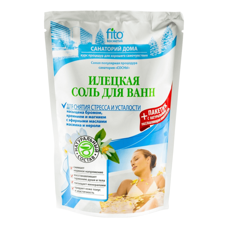 Натуральная илецкая соль с расслабляющим комплексом – это самая популярная санаторная процедура в Вашей ванне. Насыщенная бромом, кремнием и магнием Илецкая соль с натуральными эфирными маслами жасмина и нероли насыщает кожу полезными минералами, придает ей упругость и эластичность. Мгновенно снимает нервное напряжение и усталость, окутывает чувственным, нежным ароматом цветущего сада, дарит полноценный отдых и позволяет полностью забыть о проблемах. Натуральный расслабляющий комплекс благотворно влияет на состояние нервной системы, устраняет депрессию, бессонницу и тревогу, возвращает радость жизни и прекрасное настроение. Всего 15-20 минут приятного расслабления и Вы снова полны энергии, силы и бодрости, как будто только что приехали с морского побережья.