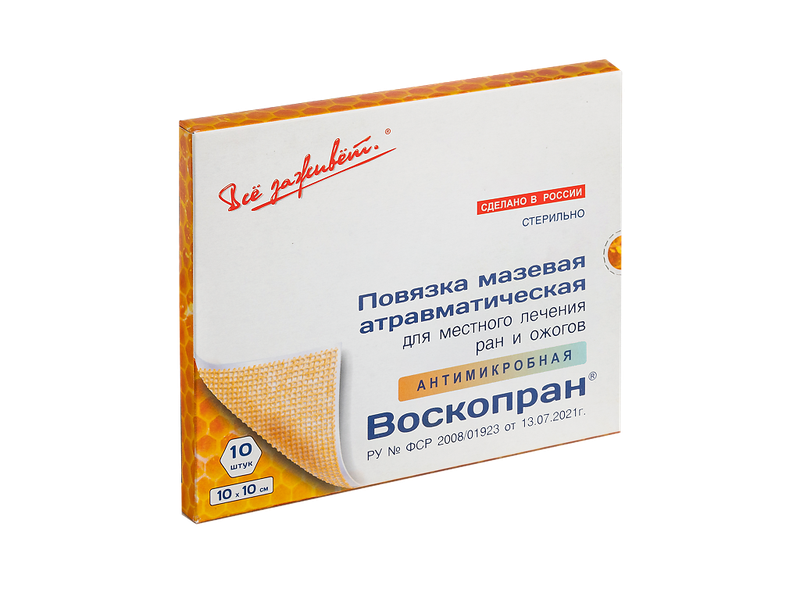 Воскопран с мазью гидроксиметилхиноксалиндиоксида 5% 10х10 см повязка мазевая атравматическая с восковым покрытием стерильная антимикробная представляет собой синтетическую сетку, пропитанную воском и лечебными мазями. Сетка обеспечивает дренажный эффект для раневого экссудата и хороший воздухообмен. Пчелиный воск содержит большое количество аминокислот, минеральных веществ и витаминов. Органика воска воспринимается раной как активная ранозаживляющая среда. Диоксидин оказывает антимикробное действие , что обеспечивает противовоспалительное и антимикробное действие повязки. Сокращение сроков заживления обусловлено выделением лекарственного вещества из повязки в глубокие слои раны и стимуляции процесса регенерации. Повязка применяется для лечения поверхностных и глубоких гнойных различной локализации, длительно незаживающих ран и трофических язв, инфицированных ожогов, гнойных ран при остеомиелитах, послеоперационных ран.