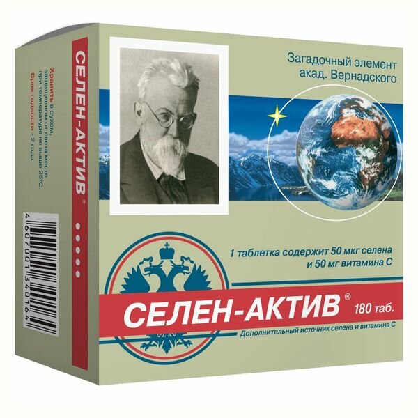 «Селен-Актив®» разработан специалистами Медицинского радиологического научного центра РАМН (г. Обнинск). Они соединили селен с биомолекулой ксантеном — антиоксидантом, который является составной частью природных антиоксидантов — витамина Е и биофлавоноидов. Полученное соединение не вызывает никаких побочных эффектов даже при концентрациях, в сотни раз превышающих предельно допустимые. Описание активных компонентов: суточная потребность человека в селене составляет 80–200 мкг. Это очень небольшая доза. При условии ежедневного поступления такого количества за всю жизнь суммарный объем не превысит и половины чайной ложки! И даже это небольшое количество, к сожалению, получить с современными продуктами питания невозможно. Наши почвы практически не содержат селена. В результате каждый второй житель России страдает дефицитом селена. Восполнить недостаток селена помогает препарат «СЕЛЕН-АКТИВ». Это абсолютно безопасное средство разработчики назвали умным элементом. Все дело в том, что молекула препарата, в которую встроен селен, в зависимости от потребности организма может работать либо как источник селена для органов и тканей, либо как самостоятельный антиоксидант. «Селен-Актив» прошел клинические исследования в ГНИЦ профилактической медицины Минздрава РФ и НИИ питания РАМН. Результаты показали, что прием таблеток «Селен-Актив» у больных с ишемической болезнью сердца, артериальной гипертонией и нарушением липидного обмена в дополнение к терапии сердечно-сосудистыми препаратами приводит к уменьшению интенсивности окислительных процессов, снижению уровня холестерина и артериального давления. «Селен-Актив» рекомендован в качестве дополнительного источника селена и витамина С: для улучшения функционального состояния сердечно-сосудистой системы; в качестве средства для нормализации обмена холестерина; для повышения функциональной активности антиоксидантной системы организма. Пищевая ценность суточной дозы в 1 таблетке (% от рекомендуемого уровня суточного потребления): селен — 50 мкг (71 %); витамин С — 50 мг (83 %).