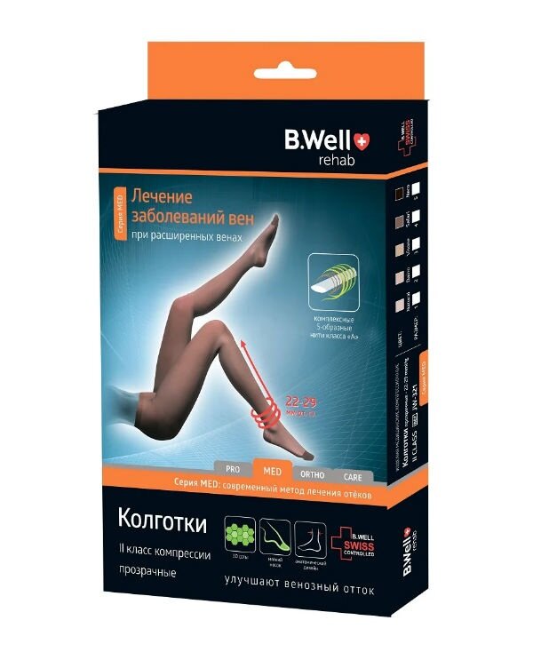 Колготки компрессионные B.Well rehab JW-321, 2 класс компрессии (22–32 мм рт. ст.) — для улучшения венозного оттока при заболеваниях вен, хронической венозной недостаточности, для профилактики тромбоза глубоких вен. Механизм действия трикотажа основан на распределенном давлении: максимальное в области щиколотки (22–32 мм рт. ст.), уменьшается в области голени, в области бедер компрессия минимальна. Регулярное ношение компрессионного трикотажа нормализует кровоток в нижних конечностях, способствует перераспределению кровотока в глубокие вены, улучшает работу венозных клапанов, уменьшает нагрузку на сердечно-сосудистую систему, препятствуют развитию варикоза. 3D-вязка — специальная вязка «объемными сотами» помогает сохранить естественный влаго- и теплообмен кожи, обеспечивает высокий комфорт ношения. Комплексные нити с двойной S-образной оплеткой во встречных направлениях обеспечивают необходимый компрессионный эффект и прочность. Комфортные шортики с мягкой текстурой, гигиенической ластовицей обеспечивают удобство ношения и хорошее прилегание. Массажный эффект — особое плетение на стопе обладает массажным эффектом, воздействует на биоактивные точки стопы, уменьшает усталость и стимулирует кровообращение. Усиленная стопа — усиленная носочная и пяточная части плотно фиксируются на стопе и уменьшают риск случайных повреждений, плоские мягкие швы обеспечивают комфорт ношения.