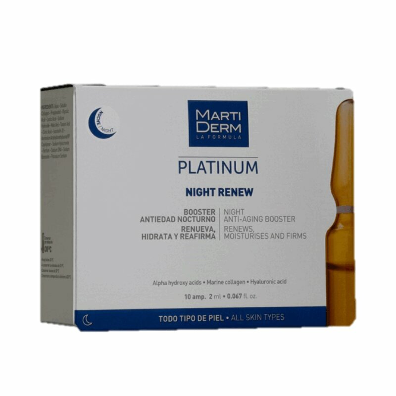 Martiderm Night Renew - это мягкий пилинг против старения с 10% AHA и морским коллагеном, чтобы обновить текстуру кожи и улучшить все признаки старения. Martiderm Night Renew -это мягкий пилинг с 10% AHA, который удаляет омертвевшие клетки кожи и повышает клеточный оборот, чтобы сделать кожу молодой и сияющей, а также улучшить текстуру кожи. 5% морской коллаген обладает наполняющим действием, которое помогает уменьшить морщины, а гиалуроновая кислота обеспечивает глубокое увлажнение. Кожа выглядит более увлажненной, а текстура и уровень увлажнения улучшаются. Морщины заполняются и кожа чувствует себя обновленной.