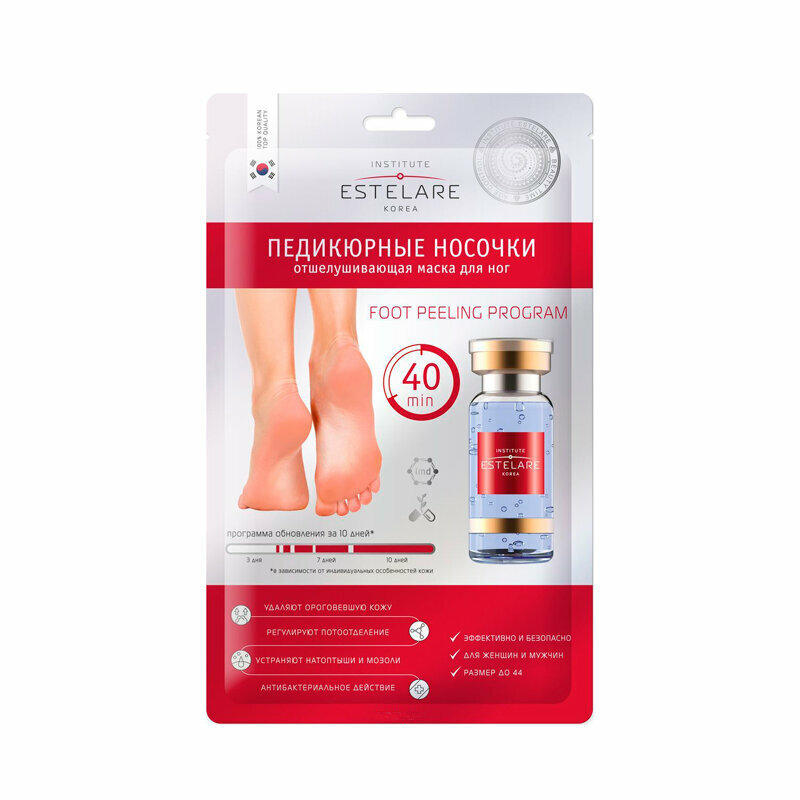 Отшелушивающая маска для ног Estelare Foot Peeling Program предназначены для отшелушивания старой огрубевшей кожи, в том числе в труднодоступных местах, в складках и на пальцах ног. Оказывают противовоспалительное, противогрибковое и дезодорирующие действие. Молочная и гликолевая кислоты проникают глубоко в слои эпидермиса и активируют регенерацию клеток. Салициловая кислота обладает противогрибковым, бактерицидным и дезодорирующим действием. Растительные масла и экстракты насыщают кожу витаминами и интенсивно ее увлажняют.