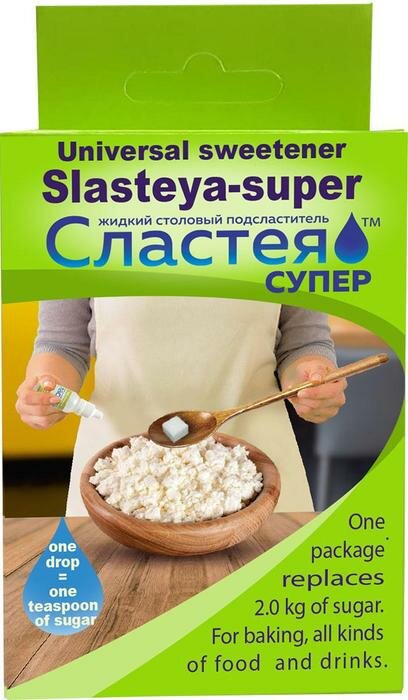 Универсальный заменитель сахара для всех видов блюд (творог, сметана), выпечки (сырники, пироги, блины) и напитков (кофе, чай, кефир, молоко). Одна капля по вкусу и сладости неотличима от чайной ложки сахара. Один флакон заменяет 2,0 кг сахара. Консерванты, стабилизаторы, соли натрия отсутствуют.