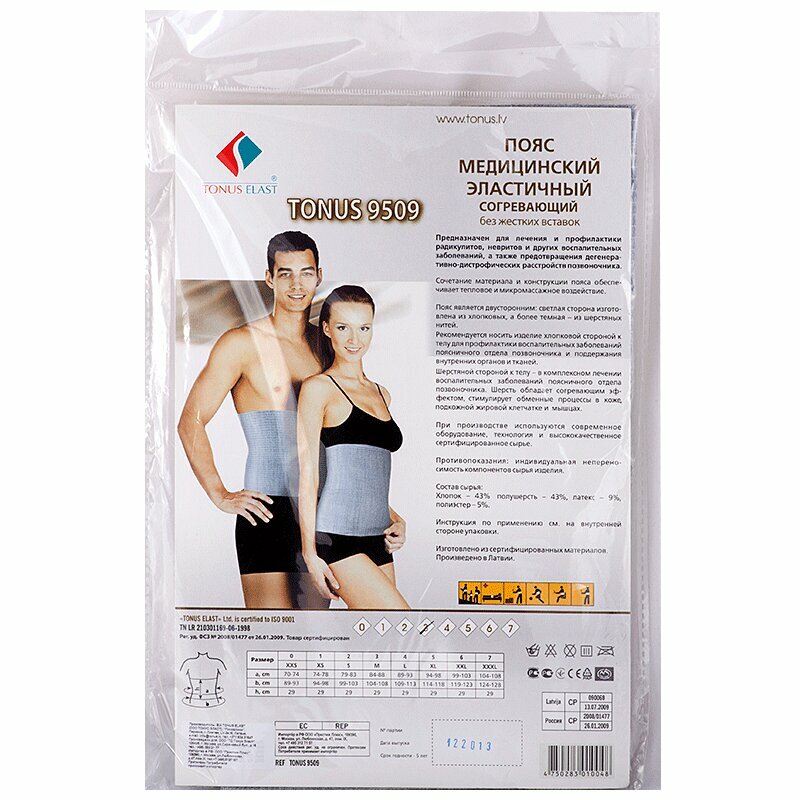 Пояс медицинский эластичный без жестких вставок - Модель TONUS 9509 - оказывает умеренную компрессию, улучшает кровообращение, присуще согревающее и микромассажное действие. Для лечения радикулита и неврита и профилактики неврологических расстройств. Цвет: серый. Размер: 3 (M)Окружность талии (а): 84-88 см. Окружность бёдер (b): 104-108 см. Высота пояса (h): 29 см. Медицинские показания. При лечении различных заболеваний: пояснично-крестцовых радикулитов и радикулопатий, при люмбалгии, ишиалгии, неосложненных грыжах межпозвоночных дисков, миофасциальных болях и вертебральном остеохондрозе (спондилёз). В до- и послеоперационный периоды: для сокращения сроков реабилитации после травм и операций на пояснично-крестцовом отделе позвоночника. В профилактических целях: для профилактики осложнений и неврологических расстройств после пояснично-крестцового радикулита. При хронических болях в пояснично-крестцовом отделе позвоночника, для профилактики профессиональных заболеваний, когда вид занятости связан с длительной статической и динамической нагрузкой на пояснично-крестцовый отдел и работой на холоде. Конструктивные решения: Используемый состав сырья является модификацией удачного сочетания древних рецептов использования хлопка, шерсти и современных полусинтетических составов. Пояс имеет структуру трехслойного эластичного переплетения, внешняя сторона которого выработана из шерстяной пряжи, а внутренняя - из хлопка. Эластичные нити образуют петли точно за петлями хлопка, не выходя на поверхность. Для усиления теплового эффекта пояс носят шерстяной стороной к телу, а для усиления массажного эффекта хлопчатобумажной стороной. Методика применения: Медицинским эластичным поясом можно пользоваться в медицинских стационарах, в процессе амбулаторного лечения, в спортивно-оздоровительных учреждениях и в домашних условиях. Подбирать размер необходимо по окружности талии согласно шкале, указанной на упаковке.