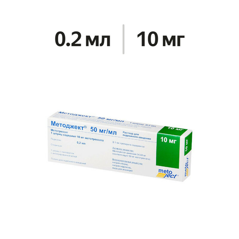 П/к. Интегрированная в шприц игла предназначена только для п/к введения препарата Методжект®. Методжект® не следует смешивать с другими лекарственными препаратами. Препарат должен назначаться врачом, имеющим опыт применения и знакомым со свойствами метотрексата и особенностями его действия. Препарат предназначен только для однократного применения. Методжект® применяют 1 раз в неделю. Пациент должен быть ясно проинформирован об однократном еженедельном режиме введения. Рекомендуется назначить для введения конкретный день недели. У пациентов с дополнительным Vd (наличие асцита, плеврального выпота) скорость выведения метотрексата из организма снижена. У таких пациентов необходимо особенно тщательно проводить контроль токсичности, снизить дозу препарата, а в некоторых случаях — прервать лечение. Взрослые пациенты с ревматоидным артритом. Рекомендуемая начальная доза — 7,5 мг метотрексата 1 раз в неделю. В зависимости от активности заболевания и переносимости метотрексата больным доза может быть постепенно увеличена (по 2,5 мг/нед). Максимальная доза при лечении ревматоидного артрита, как правило, не должна превышать 25 мг/нед. При этом повышение дозы метотрексата до величин более 20 мг/нед может сопровождаться существенным увеличением токсичности, в первую очередь — подавлением функции костного мозга. Ответ на лечение обычно наступает через 4–8 нед после начала применения препарата. После достижения желаемого ответа следует начинать постепенное снижение дозы до наиболее низкой эффективной поддерживающей дозы. Дети до 16 лет с полиартритной формой ювенильного хронического артрита. Рекомендуемая доза составляет 10–15 мг/м 2 1 раз в неделю. В случае недостаточной эффективности лечения доза может быть увеличена вплоть до 20 мг/м2 1 раз в неделю. При увеличении вводимой дозы необходимо увеличить частоту проводимых обследований больного. Пациенты с ювенильным ревматоидным артритом должны наблюдаться ревматологом-специалистом по лечению детей и подростков. Пациенты с псориазом и псориатическим артритом. За неделю до начала лечения рекомендуется ввести парентерально тест-дозу 5–10 мг метотрексата для выявления возможных реакций непереносимости. Рекомендуемая начальная доза — 7,5 мг метотрексата 1 раз в неделю. Дозу следует постепенно увеличить, при этом максимальная доза не должна превышать 25 мг/нед метотрексата. Применение доз свыше 20 мг/нед может сопровождаться значительным увеличением токсичности, в первую очередь подавлением функции костного мозга. Ответ на лечение обычно наступает через 2–6 нед после начала применения препарата. После достижения желаемого ответа доза должна быть постепенно снижена до наиболее низкой эффективной поддерживающей дозы. В исключительных случаях, когда это клинически оправдано, могут применяться дозы свыше 25 мг, однако при всех случаях не более 30 мг/нед ввиду резкого увеличения токсичности. Особые группы пациентов Дети. Использование препарата Методжект® у детей до 3 лет не рекомендовано из-за недостаточности данных об эффективности и безопасности использования препарата у этой группы пациентов. Почечная недостаточность. Методжект® должен применяться с осторожностью. Дозу, в зависимости от значения Cl креатинина, следует скорректировать в соответствии со следующей таблицей. Нару