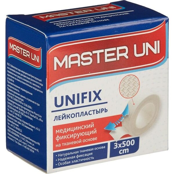 Лейкопластырь master uni unfix медицинский фиксирующий на тканевой основе 3x500 см – универсальный рулонный лейкопластырь белого цвета в индивидуальной упаковке. Лейкопластырь фиксирующий на тканевой основе предназначен для фиксации повязок, компрессов и предметов медицинского назначения (катетеров, трубок, зондов, канюль, датчиков и других медицинских предметов на теле пациента). Может использоваться при оказании первой помощи для фиксации поврежденных пальцев и суставов. Надежно фиксируется благодаря механической прочности основы и высокой адгезии. Эластичный материал, который повторяет изгибы тела и не стесняет движения. Использовать на чистой и сухой коже. Вскрыть упаковку, зафиксировать лейкопластырь на сухой чистой коже. Рекомендуется менять лейкопластырь по мере необходимости, но не реже одного раза в день.