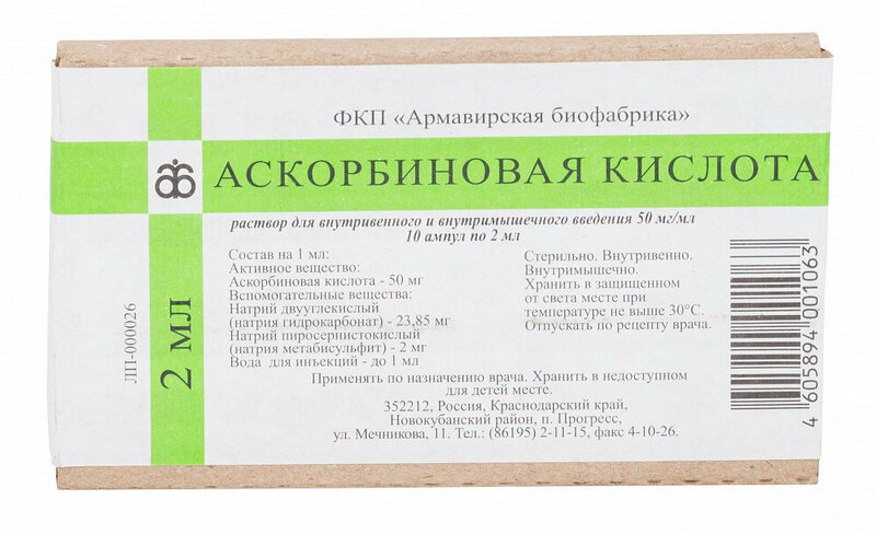 1 мл содержит: аскорбиновая кислота 50 мг. Вспомогательные вещества: натрий двууглекислый (натрия гидрокарбонат) -23,85 мг, натрий пиросернистокислый (натрия метабисульфит) - 2 мг, вода для инъекций - до 1 мл.