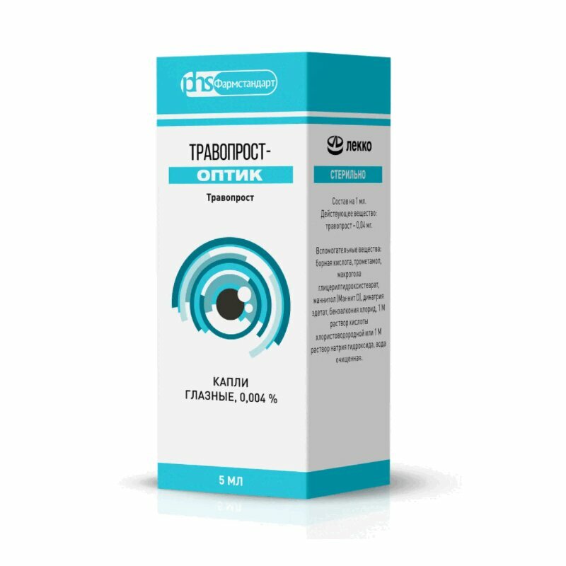 Травопрост 0.04 мг. Вспомогательные вещества: борная кислота - 3 мг, трометамол - 1.2 мг, макрогола глицерилгидроксистеарат - 5 мг, маннитол (маннит D) - 46 мг, динатрия эдетат - 0.1 мг, бензалкония хлорид (в пересчете на безводное вещество) - 0.15 мг, 1М раствор хлористоводородной кислоты или 1М раствор натрия гидроксида - до pH 5.5-6.5, вода очищенная - до 1 мл.