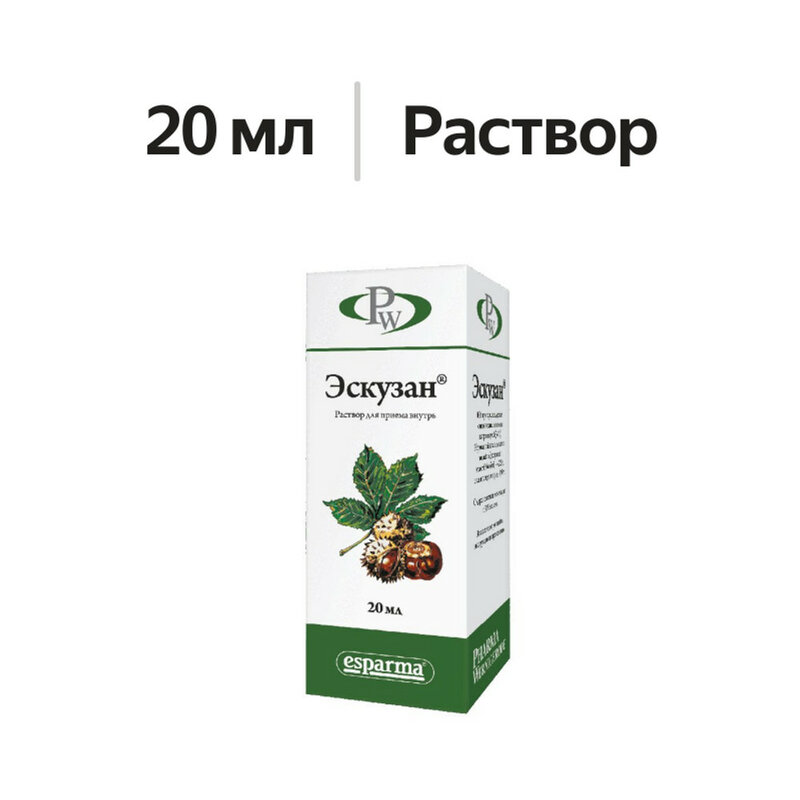 Препарат, применяемый при нарушениях венозного кровообращения. Содержит экстракт плодов конского каштана, оказывает антиэкссудативное, венотонизирующее действие. Установлено, что экстракт плодов конского каштана уменьшает концентрацию лизосомальных энзимов, в результате этого снижается распад мукополисахаридов в области стенок капилляров. Эскузан снижает проницаемость сосудов, предотвращая фильтрацию низкомолекулярных протеинов, электролитов и воды в межклеточное пространство. В рандомизированных двойных слепых и перекрестных исследованиях отмечалось снижение транскапиллярной фильтрации и значительное уменьшение отеков, уменьшение чувства тяжести, усталости, напряженности, зуда, боли. Всасывание и распределение После приема внутрь 50 мг экстракта плодов конского каштана C max в плазме крови достигается через 2.35 ч и составляет 25.31 нг/мл. Связывание с белками плазмы составляет 84%. Выведение T 1/2 составляет 19.87 ч. После приема внутрь 0.11% экстракта плодов конского каштана выводится почками в виде эсцина.