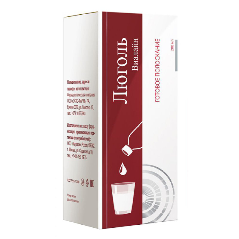 Люголь Виалайн готовое полоскание - не является лекарственным средством. Препарат на основе экстракта грецкого ореха, экстракта коры дуба и экстракта зверобоя применяется с профилактическими и гигиеническими целями. Люголь Виалайн - готовый к применению раствор для полоскания. Компоненты средства обладают антисептическим и противовоспалительным эффектами. Применяется при инфекционно-воспалительных заболеваниях горла, а также слизистой оболочки ротовой полости. Активные ингредиенты: Экстракт зеленого грецкого ореха - уникальный источник природного йода; Экстракт коры дуба - содержащиеся в нем дубильные вещества оказывают вяжущие и противовоспалительное действие; Экстракт зверобоя - используют как вяжущие и антисептическое средство.