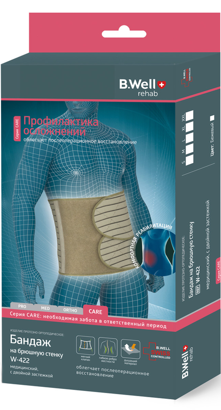 Бандаж на брюшную стенку B.Well rehab W-422, предназначен для фиксации брюшной стенки после операций, применяется для восстановления в послеоперационном периоде, предотвращает осложнения, способствует формированию и заживлению послеоперационного рубца, в том числе и глубокого, мышечного.