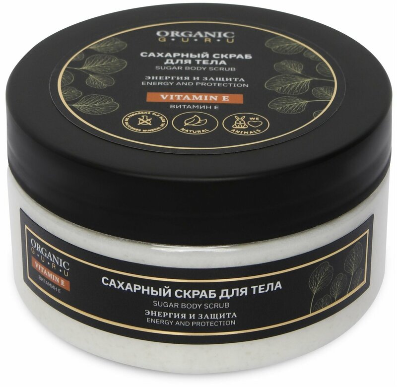 Сахарный скраб для тела "VITAMIN E" Энергия и защита от Organic Guru! Натуральный скраб с нежной кремовой текстурой на основе тростникового сахара деликатно очищает кожу и улучшает её состояние. Витамин Е в составе скраба оказывает антиоксидантный эффект, защищая клетки эпидермиса. Комплекс масел миндаля и масла ши разглаживает и укрепляет кожу. Не вызывает раздражений и шелушений. Хорошо смывается водой, оставляю кожу гладкой и шелковистой. Не содержит силиконов, минеральных масел, парабенов.