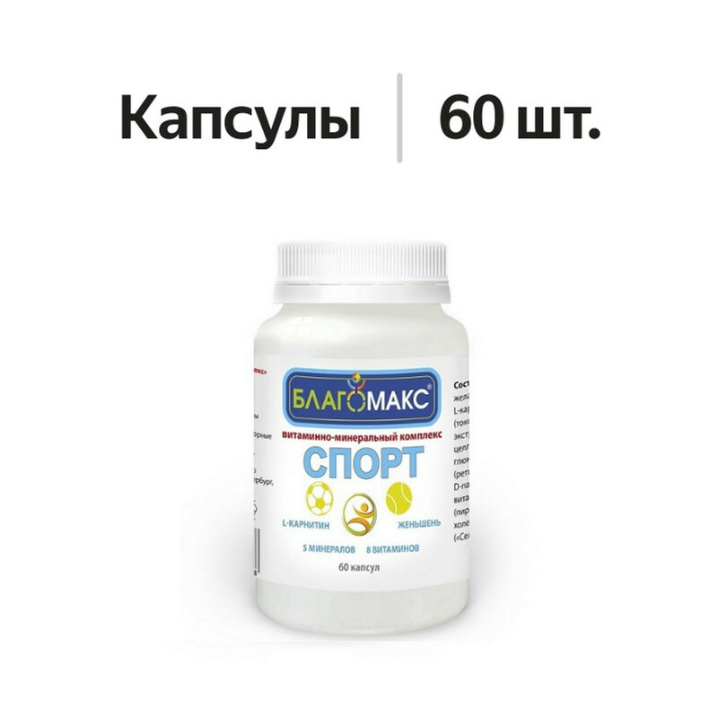 В состав «Благомакс Спорт» входит богатый набор необходимых при физических нагрузках витаминов и минералов в биодоступной форме. Также комплекс усилен экстрактом корня женьшеня и L-карнитином. L-карнитин - важный компонент мышечной ткани, способствует расщеплению жиров и эффективной работе мышц. Экстракт женьшеня - природный адаптоген, повышает умственную и физическую работоспособность.