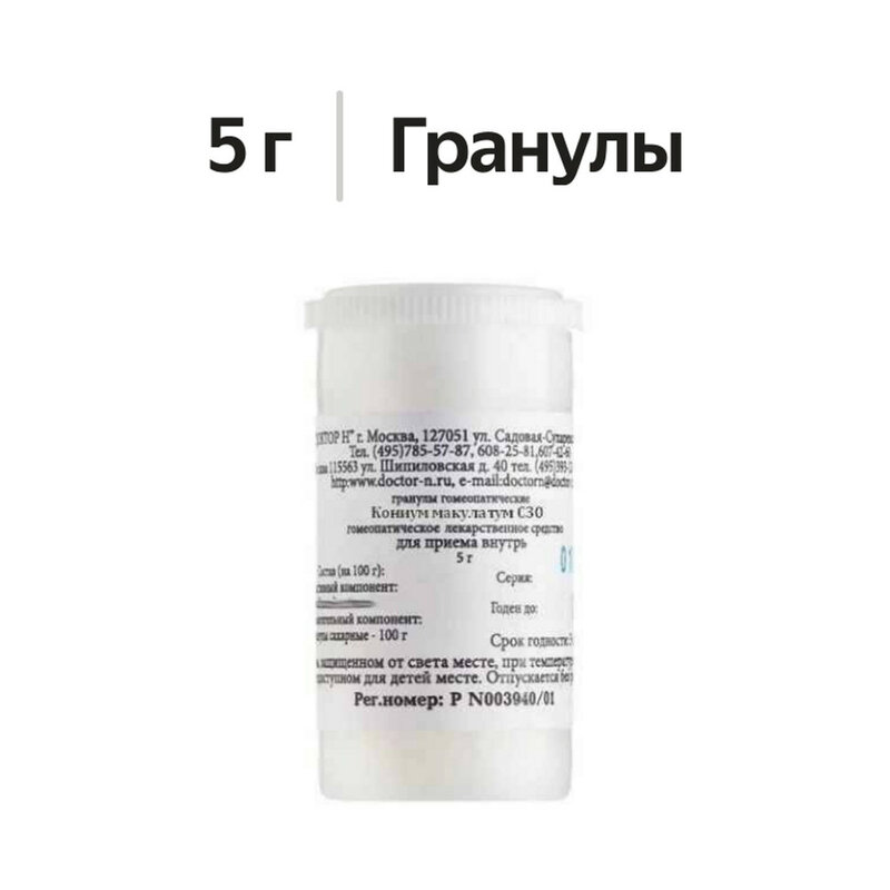 Активные вещества: Conium maculatum /Conium/ (Кониум макулатум) С30, вспомогательные вещества: гранулы сахарные - 100 г.