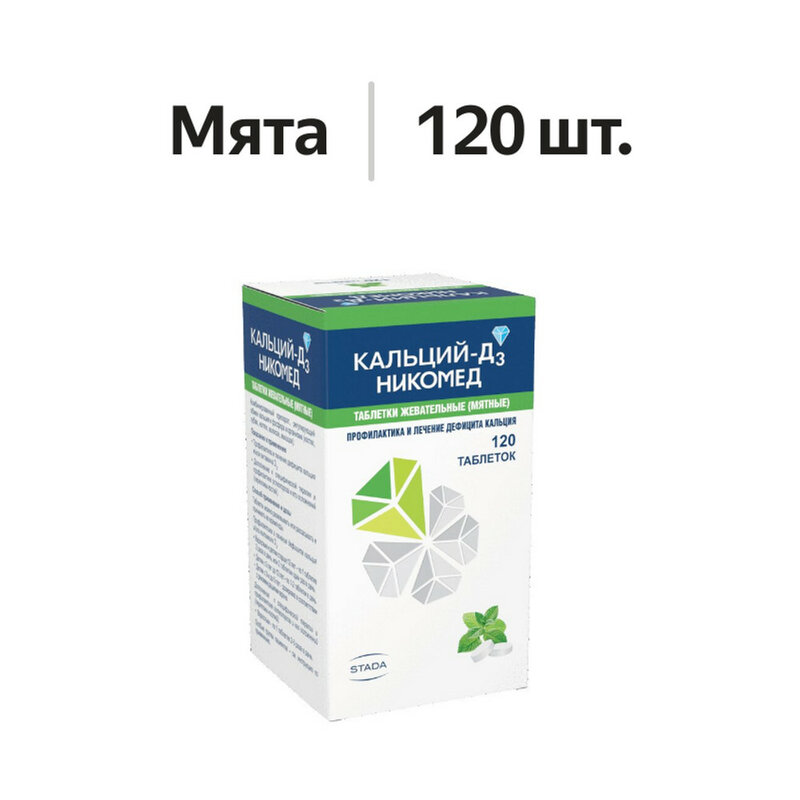 Кальция карбонат - 1250 мг (эквивалентно элементарному кальцию - 500 мг), колекальциферол (витамин D3) - 5,0 мкг (200 МЕ) в виде концентрата колекальциферола - 2,0 мг. Вспомогательные вещества: сорбитол - 390 мг, ароматизатора мятного гранулят - 31,8 мг, повидон К-30 - 36,4 мг, магния стеарат - 6,00 мг, аспартам - 1,00 мг.