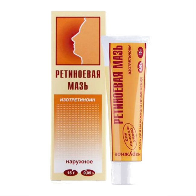 Изотретиноин - 500 мкг. Вспомогательные вещества: бутилгидрокситолуол – 0.05 г, бутилгидроксианизол – 0.025 г, воск эмульсионный – 8 г, вазелиновое масло – 8 г, глицерол (глицерин) – 10 г, этанол (спирт этиловый) 95% – 10 г, вода очищенная до 100 г.