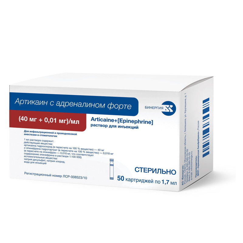 1 мл артикаина гидрохлорид* 40 мг эпинефрин гидротартрат* (в пересчете на эпинефрин) 0.018 мг (0.01 мг), что соответствует содержанию эпинефрина в растворе 1:100000 * (в пересчете на 100% вещество). Вспомогательные вещества: натрия дисульфит - 0.5 мг, натрия хлорид - 1 мг, вода д/и - до 1 мл.