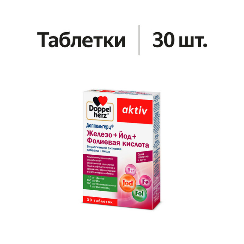 орто-Фосфат кальция 2-замещенный (агент антислеживающий), железа фумарат (железо), целлюлоза микрокристаллическая (агент антислеживающий), диоксид кремния аморфный (агент антислеживающий), кроскармеллоза (стабилизатор), гидроксипропилметилцеллюлоза (загуститель), соли магния стеариновой кислоты (агент антислеживающий), цианокобаламин (витамин В12), диоксид титана (краситель), шеллак (глазирователь), целлюлоза в порошке (агент антислеживающий), тальк (агент антислеживающий), оливковое масло, фолиевая кислота, оксиды и гидроксиды железа (красители), Твин 80 (эмульгатор), йодат калия (йод)