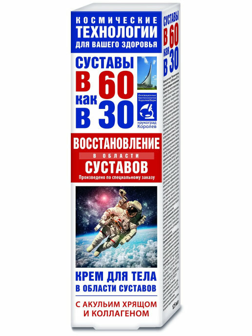 Космические технологии в 60 как в 30 акулий хрящ коллаген крем для тела - это эффективное косметическое средство для ухода за телом в области суставов. Содержит акулий хрящ - превосходный биодоступный источник незаменимого хондроитина. Хондроитин - основной структурный компонент хряща и естественный защитник (хондропротектор) его клеток. Повышает влагоемкость хряща, предотвращает его высыхание. Глюкозамин - неотъемлемый элемент хрящевой ткани. Средство разработано специально для предотвращения преждевременных и возрастных дегенеративно-дистрофических процессов в тканях суставов и активного обновления хрящевой ткани суставов пациентов в возрасте от 50 лет. Применяется в комплексном лечении, наряду с лекарственными препаратами, как дополнение.