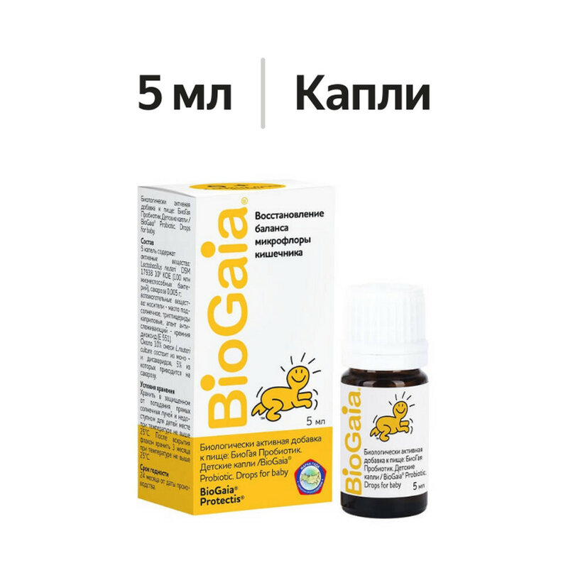 Активные вещества: Lactobacillus reuteri DSM 17938 (L. reuteri Protectis) 108 КОЕ (100 млн жизнеспособных бактерий), сахароза 0,005 г. Вспомогательные вещества: носители; масло подсолнечное, триглицериды каприловые, агент антислеживающий; кремния диоксид (Е 551).